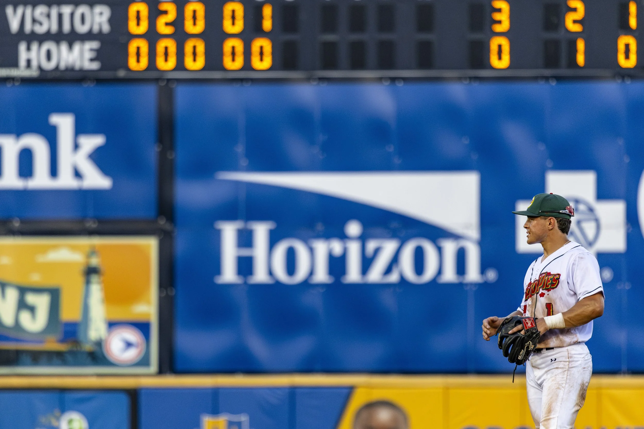 Baseball player in green hat and white jersey standing in front of blue advertisements and the score in the top of the image
